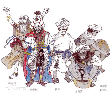 印度种姓制度源于印度教,又称瓦尔纳制度,是在后期吠陀时代形成的,具有3000多年历史。这一制度将人分为4个等级,即婆罗门、刹帝利、吠舍和首陀罗。一张根据《梨俱吠陀·原人歌》所绘的瓦尔那等级:婆罗门是原人的嘴、刹帝利是原人的双臂、吠舍是原人的大腿、首陀罗是原人的脚。至于贱民,则被排除在原人的身体之外。